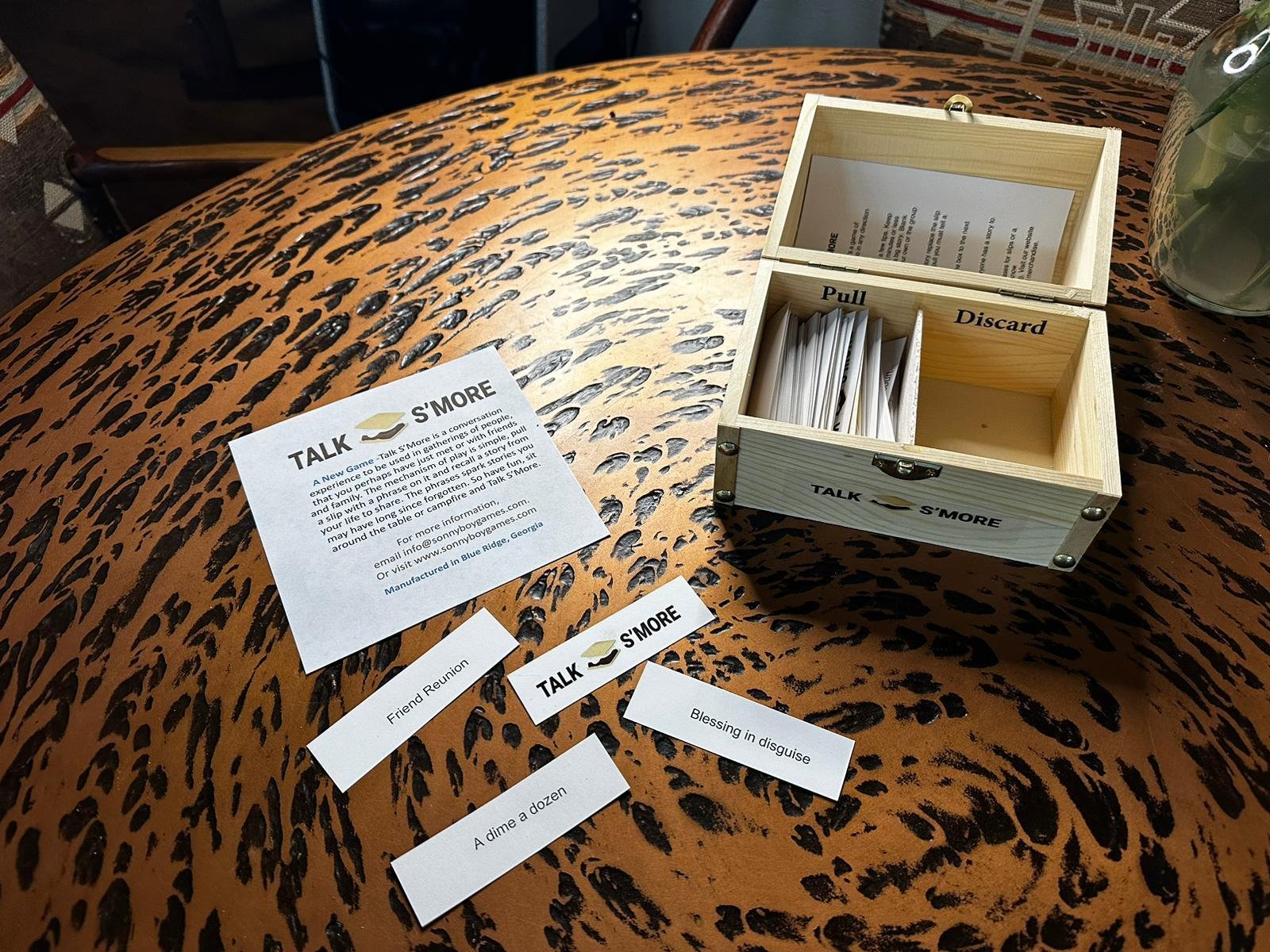Talk S’More is a conversation experience in gatherings of people that you perhaps just met or with friends and family. Pull a slip with a phrase and share a related story. Pull up a seat around a campfire or a table and Talk S’More.
